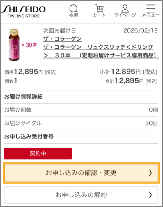 ● 資生堂オンラインストアでは、お客さまに事前に告知のうえ、定期お届けサービスの内容(お届けする商品の内容・タイプ、価格、割引率、送料、お届け方法、お届けサイクル、お届け日時等、定期お届けサービスに関連するすべて)を変更する場合があります。変更後の定期お届けサービスの利用を希望されない場合は、マイページより、別途お知らせする期日までに変更又は解約のお手続きをしてください。所定の期日までに変更又は解約の手続きをされない場合は、変更内容を承諾したものとみなします。