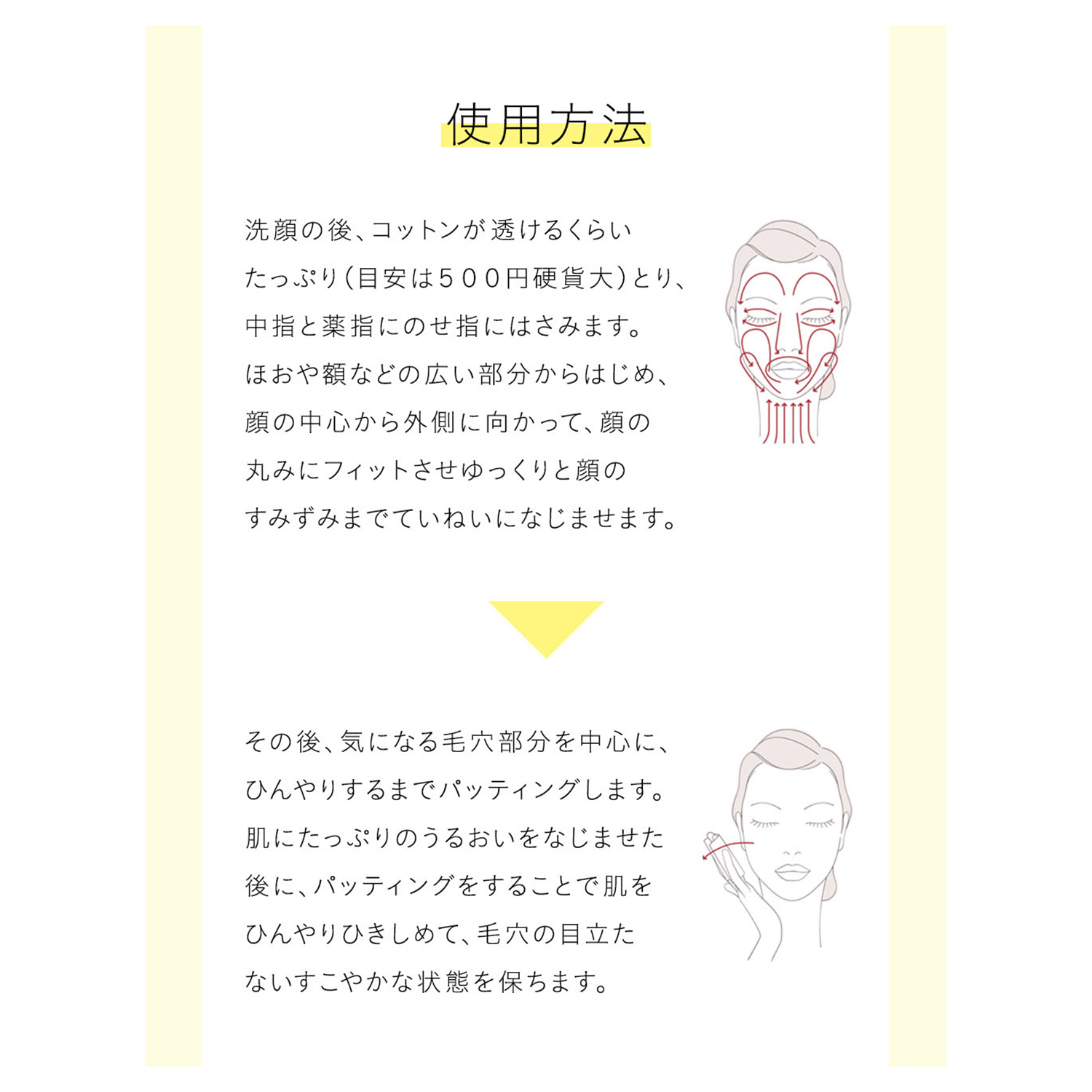 肌にたっぷりのうるおいをなじませた後に、パッティングをすることで肌をひんやりひきしめて、毛穴の目立たないすこやかな状態を保ちます。