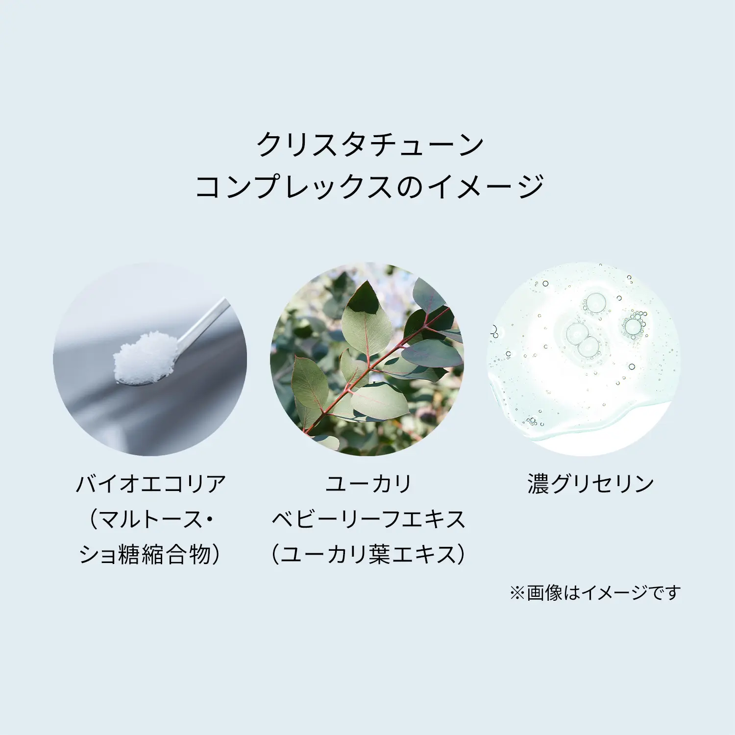 - 4-メトキシサリチル酸カリウム塩*,トラネキサム酸*,トリメチルグリシン,マルトース・ショ糖縮合物,ユーカリエキス,加水分解シルク液,加水分解コンキオリン液,L-テアニン,トウキエキス(1),シソエキス(1),精製水,ジプロピレングリコール,エタノール,メチルフェニルポリシロキサン,濃グリセリン,デカメチルテトラシロキサン,トリ2-エチルヘキサン酸グリセリル,無水ケイ酸,モノステアリン酸ポリオキシエチレングリセリル,メチルポリシロキサン,ポリオキシエチレン(14)ポリオキシプロピレン(7)ジメチルエーテル,イソステアリン酸ポリオキシエチレングリセリル,ベヘニルアルコール,イソステアリン酸,1,3-ブチレングリコール,重質流動イソパラフィン,バチルアルコール,ポリオキシエチレンデシルテトラデシルエーテル・ヘキサメチレンジイソシアネート・ポリエチレングリコール11000共重合体,カルボキシビニルポリマー,ラウリルジメチルアミノ酢酸ベタイン,トレハロース,N-ラウロイル-L-グルタミン酸ジ(フィトステリル・2-オクチルドデシル),エデト酸二ナトリウム,キサンタンガム,水酸化カリウム,3-O-エチルアスコルビン酸,ピロ亜硫酸ナトリウム,グリチルリチン酸ジカリウム,酢酸DL-α-トコフェロール,ユリエキス,無水エタノール,オリーブ葉エキス,塩酸グルコサミン,グリシン,テンチャエキス,紅茶エキス,マンゴスチン樹皮エキス,ヨモギエキス(2),アセンヤクエキス,サイコエキスBS,チンピエキス,酵母エキス(3),ケイ皮エキス,フェノキシエタノール,香料,雲母チタン *は「有効成分」無表示は「その他の成分」