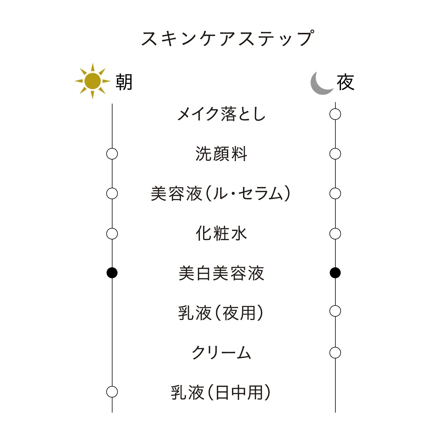 輝き続ける肌のために。シミ・そばかすの予防に加え、乾燥によるくすみ印象にうるおいを与えて透明感が満ち溢れた肌に導く美白美容液です。