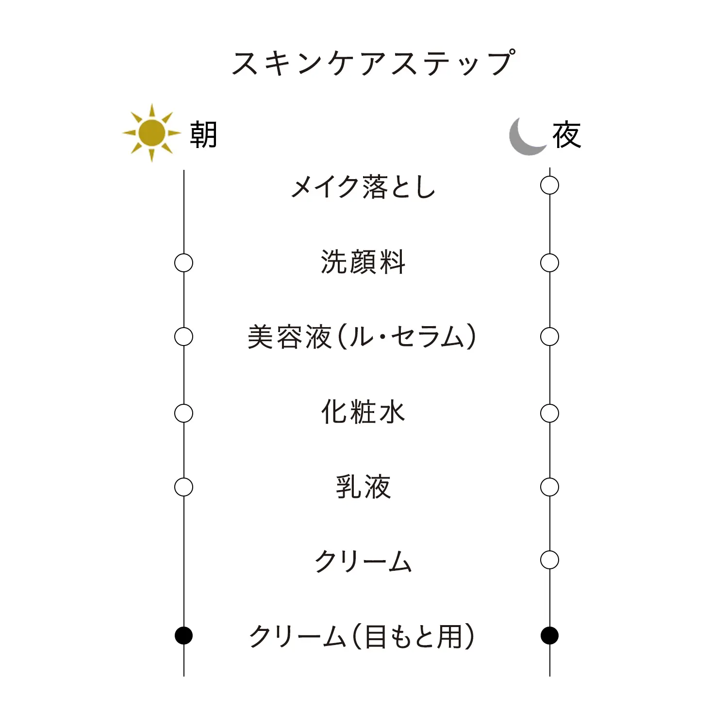 ●夜は、顔全体のお手入れの最後に、朝は紫外線防御効果のある製品の前にお使いください。
