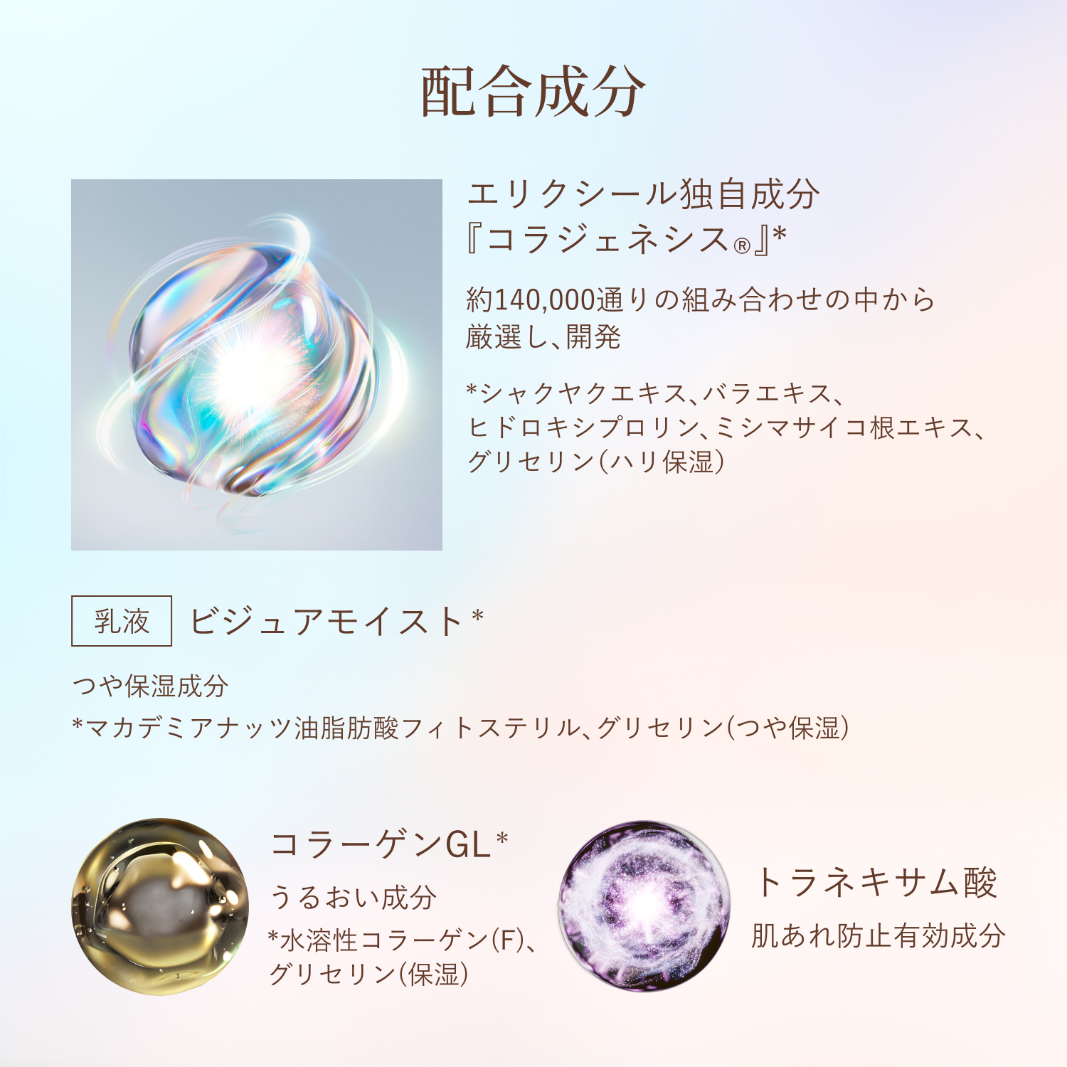 - トラネキサム酸*,シャクヤクエキス,バラエキス,L-オキシプロリン,サイコエキスBS,水溶性コラーゲン(F),マカデミアナッツ油脂肪酸フィトステリル,メリロートエキス,イノシット,精製水,ジプロピレングリコール,濃グリセリン,1,3-ブチレングリコール,ジグリセリン,ポリオキシエチレン(17)ポリオキシプロピレン(4)ジメチルエーテル,メチルフェニルポリシロキサン,トリ2-エチルヘキサン酸グリセリル,重質流動イソパラフィン,ポリエチレングリコール1500,ポリオキシエチレン(14)ポリオキシプロピレン(7)ジメチルエーテル,ポリエチレングリコール400,ポリオキシエチレン硬化ヒマシ油,クロルフェネシン,カルボキシビニルポリマー,ポリオキシエチレン・メチルポリシロキサン共重合体,アクリル酸・メタクリル酸アルキル共重合体,ラウリルジメチルアミノ酢酸ベタイン,エデト酸二ナトリウム,N-ラウロイル-L-グルタミン酸ジ(フィトステリル・2-オクチルドデシル),キサンタンガム,ポリアクリル酸ナトリウム,ピロ亜硫酸ナトリウム,フェノキシエタノール,香料 *は「有効成分」無表示は「その他の成分」