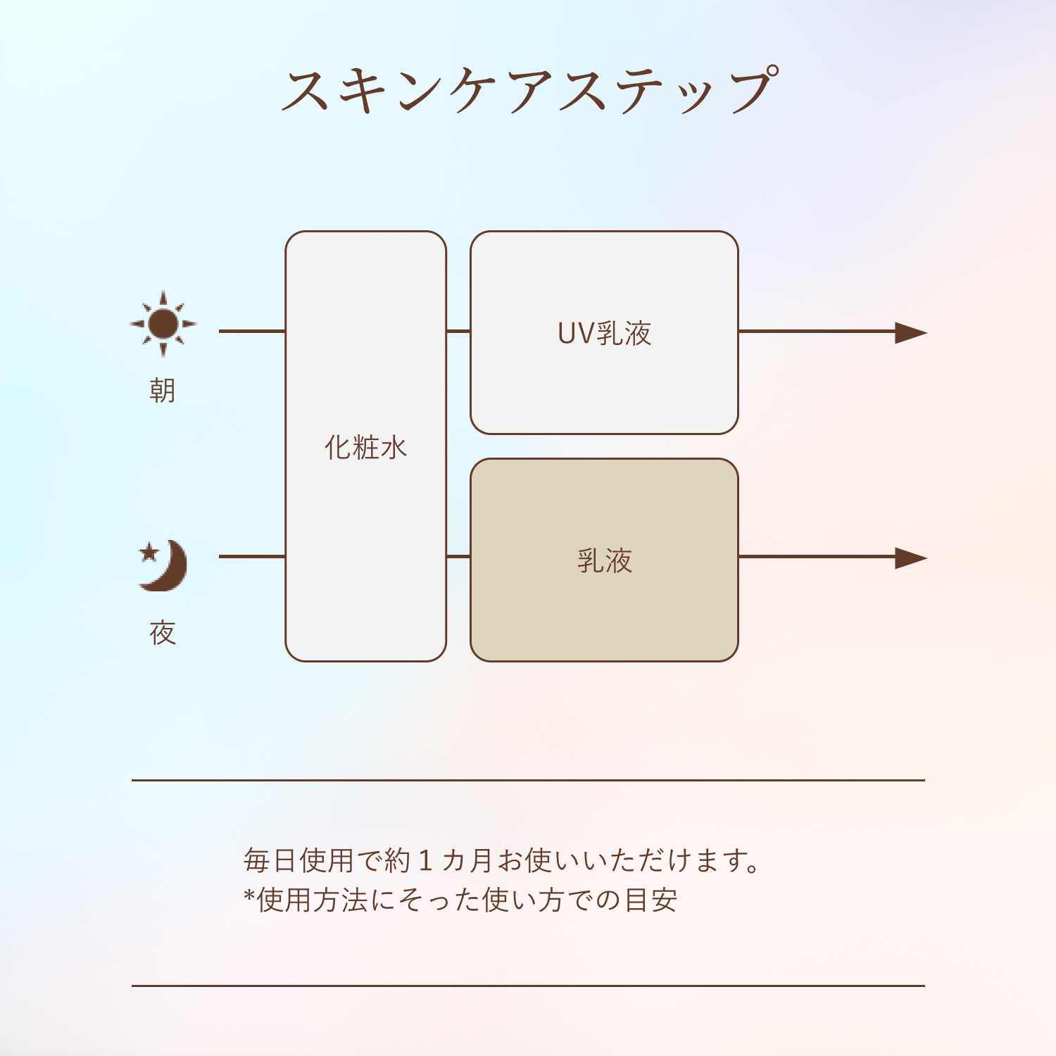 ●朝・夜の化粧水の後、手のひらに適量をとり、ていねいになじませます。