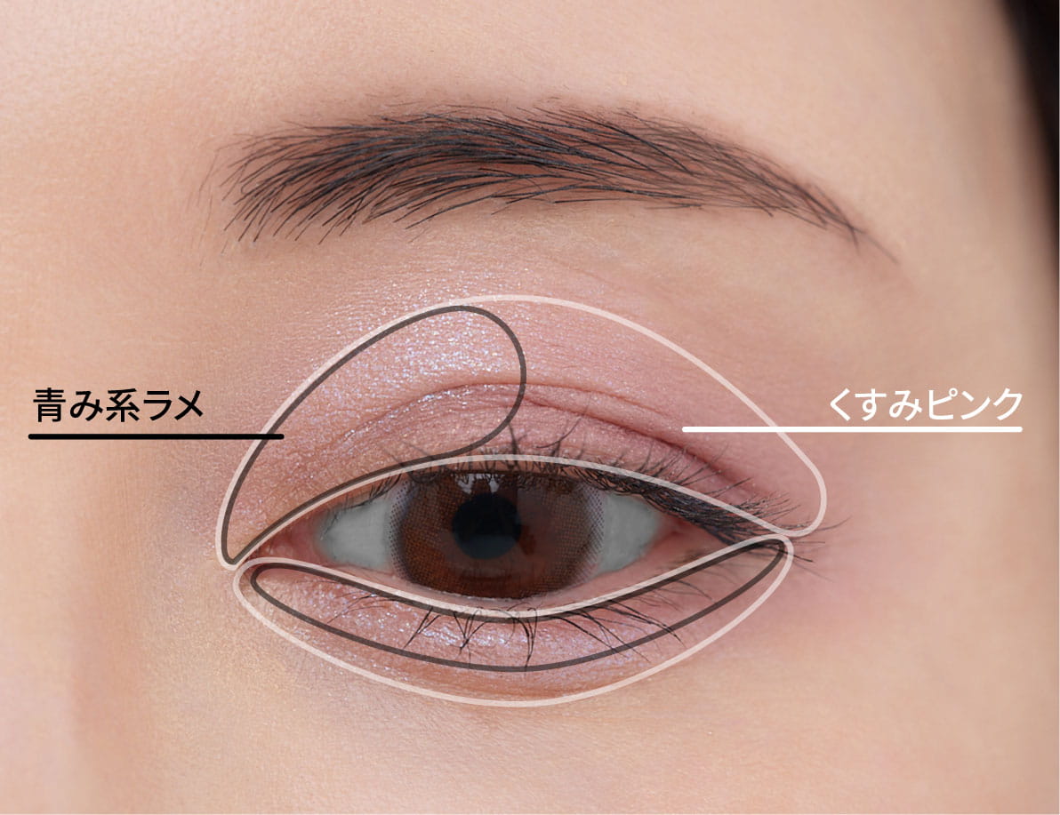 【目もと】くすみピンク×青みラメで、華やかで澄んだ目もとに
