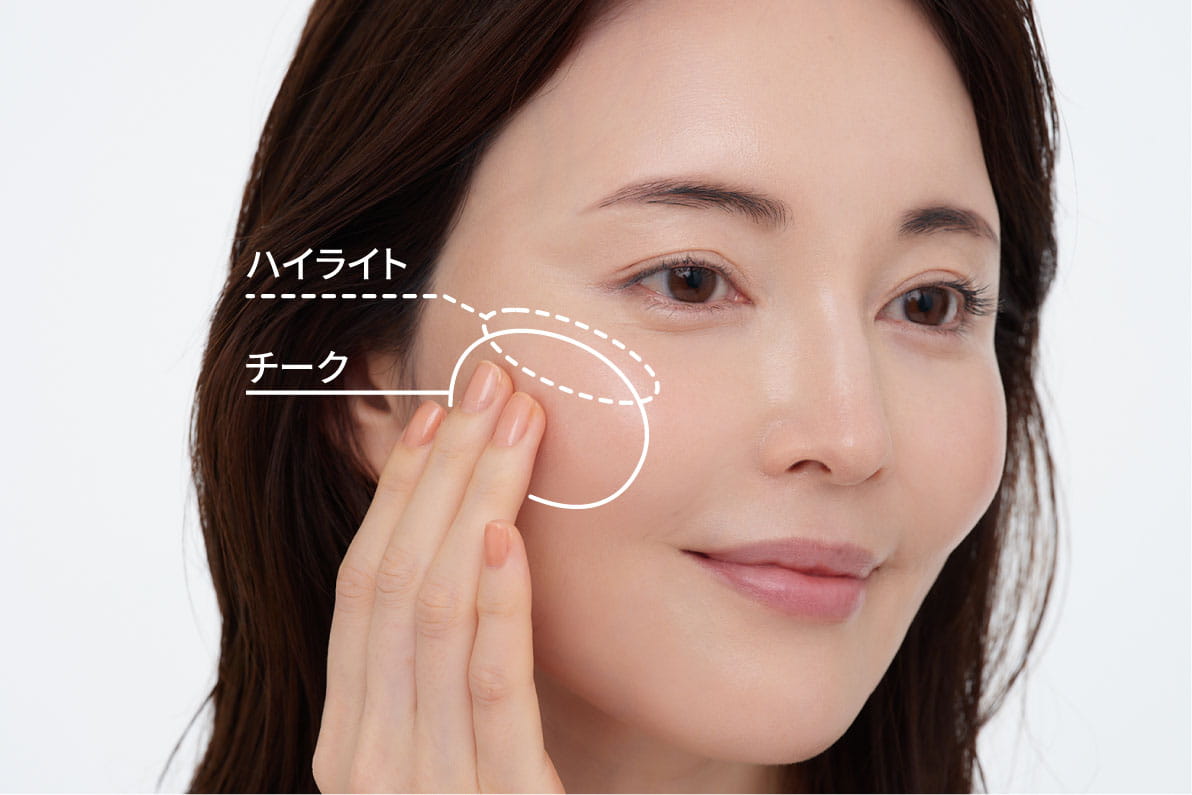 ほおの高い位置にハイライトカラーを塗布すると、より透明感がアップします。
