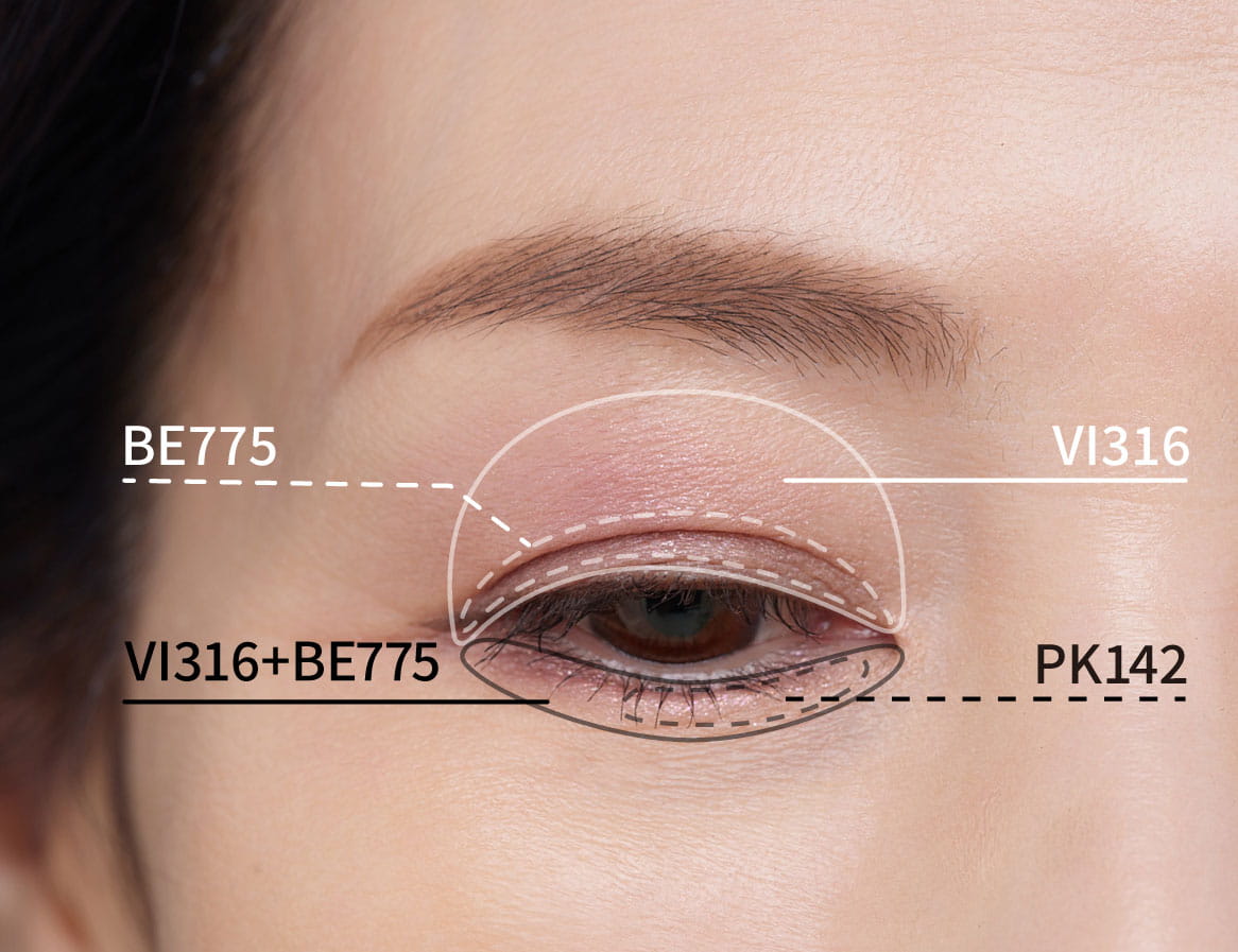 青みピンクとブラウンを使って、透明感と血色感を高めつつ、今っぽい抜け感のある目もとに仕上げましょう。