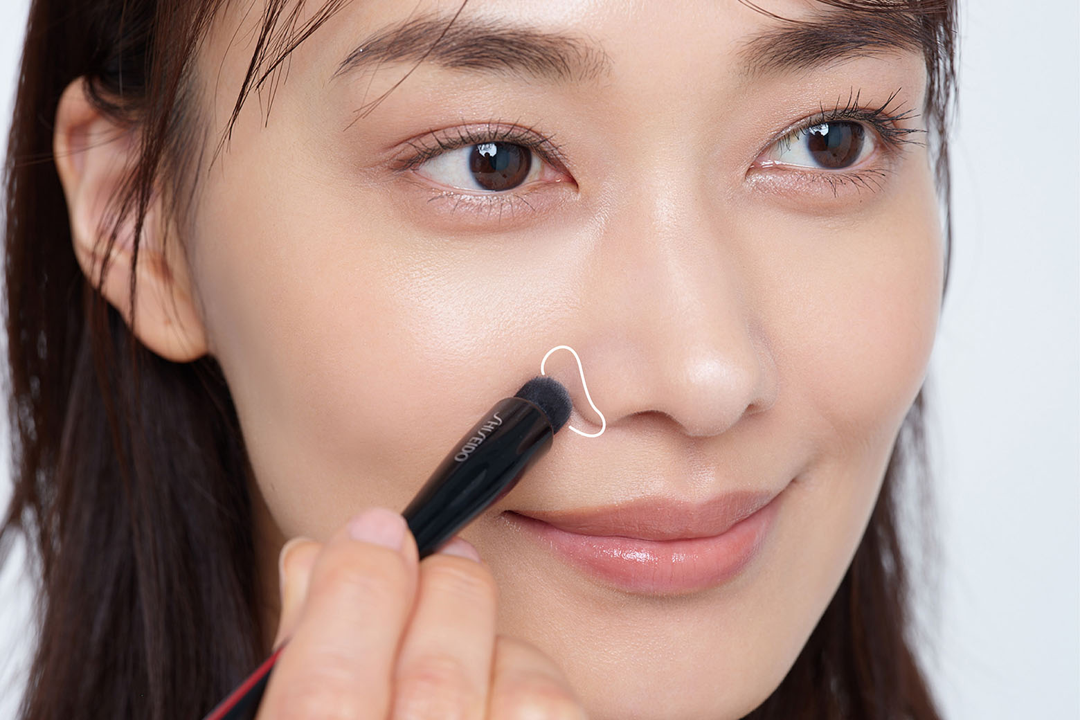 インウイ ハイライター 01 プラチナをSHISEIDO メーキャップ TSUTSU FUDE コンシーラーブラシに少量含ませ、鼻のつけ根と鼻先へ塗布して顔の中央に直線的な印象をプラスしましょう。ハイライトを先にいれることで、鼻まわりのシェーディングが強くなりすぎないよう、大人でも不自然にならないようにすることが出来ます。