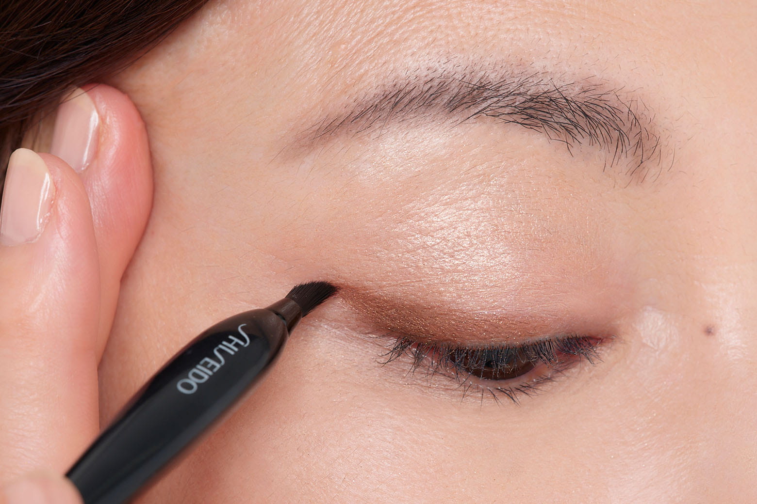SHISEIDO メーキャップ KATANA FUDE アイ ライニング ブラシの先にマキアージュ カスタマイズアイカラー シングル 運命のブラウンカラー BR533 キャラメルガナッシュを少量とったら、片手で上まぶたを引き上げながら目尻のみに細く、長めにラインを引きます。
