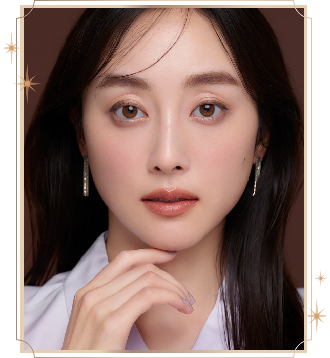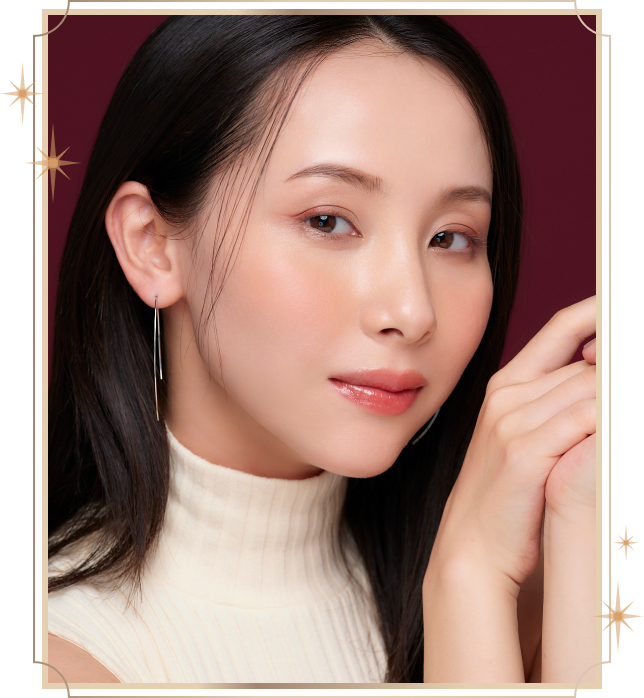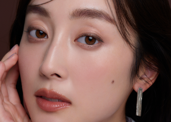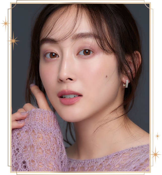 定番のブラウンラベンダーカラーをきかせたアイメイクは、落ち着きのなかに洗練された透明感を放ちます。