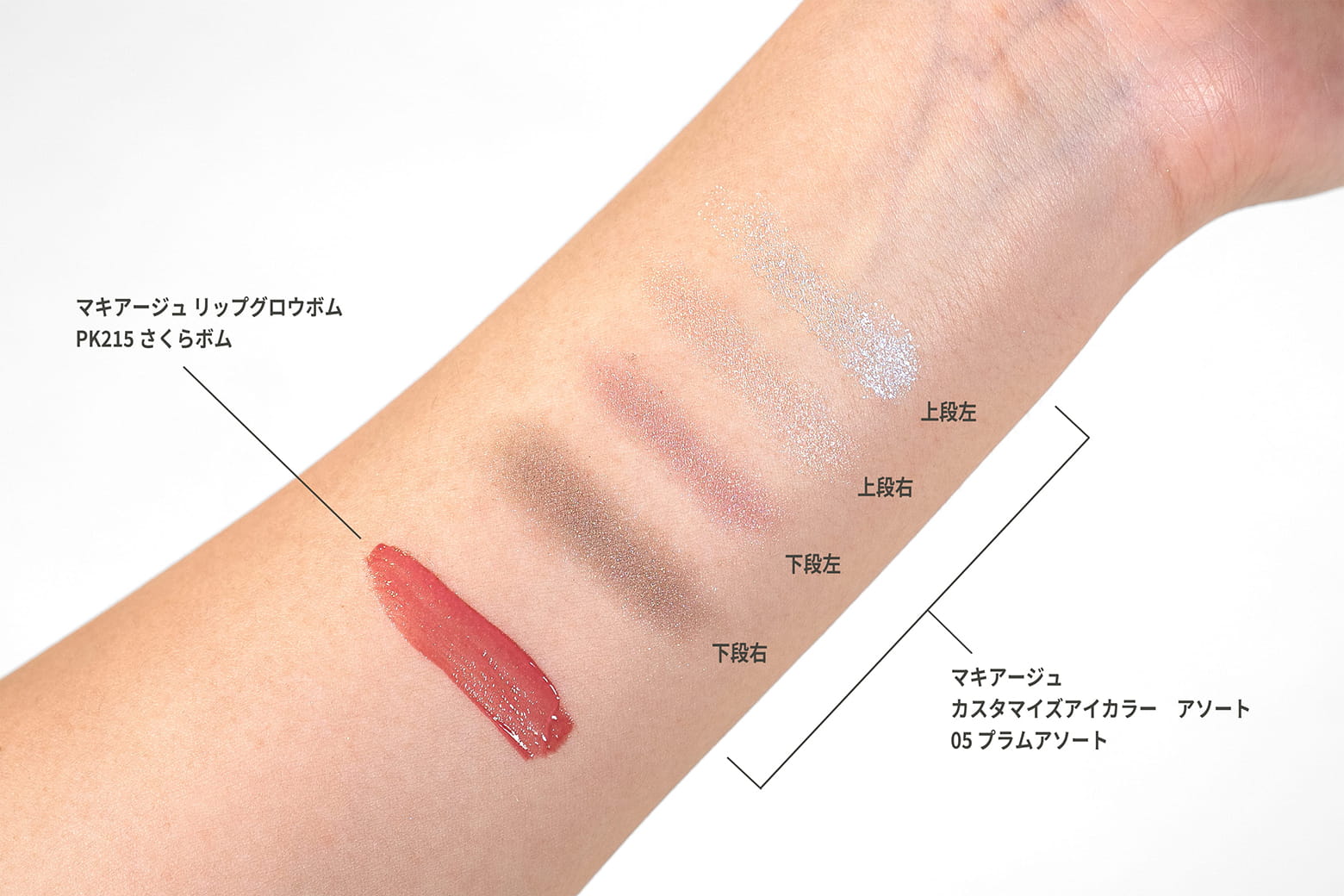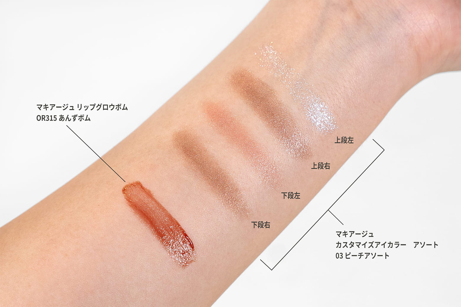 マキアージュ カスタイマイズアイカラー アソート 03 ピーチアソートで目もとにはクリアなきらめきを、マキアージュ リップグロウボム OR315 あんずボムで口もとにはつるんとした光沢を与えましょう。