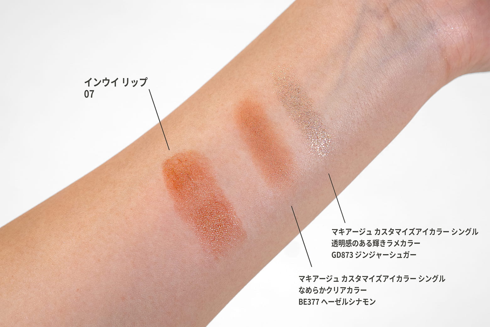 アイシャドウにはマキアージュ カスタマイズアイカラー シングル なめらかクリアカラー BE377(マット) ヘーゼルシナモンとマキアージュ カスタマイズアイカラー シングル 透明感のある輝きラメカラー GD873 ジンジャーシュガーをチョイスして、色ではなく立体感と輝きを意識することで唇の存在感を引き立てます。