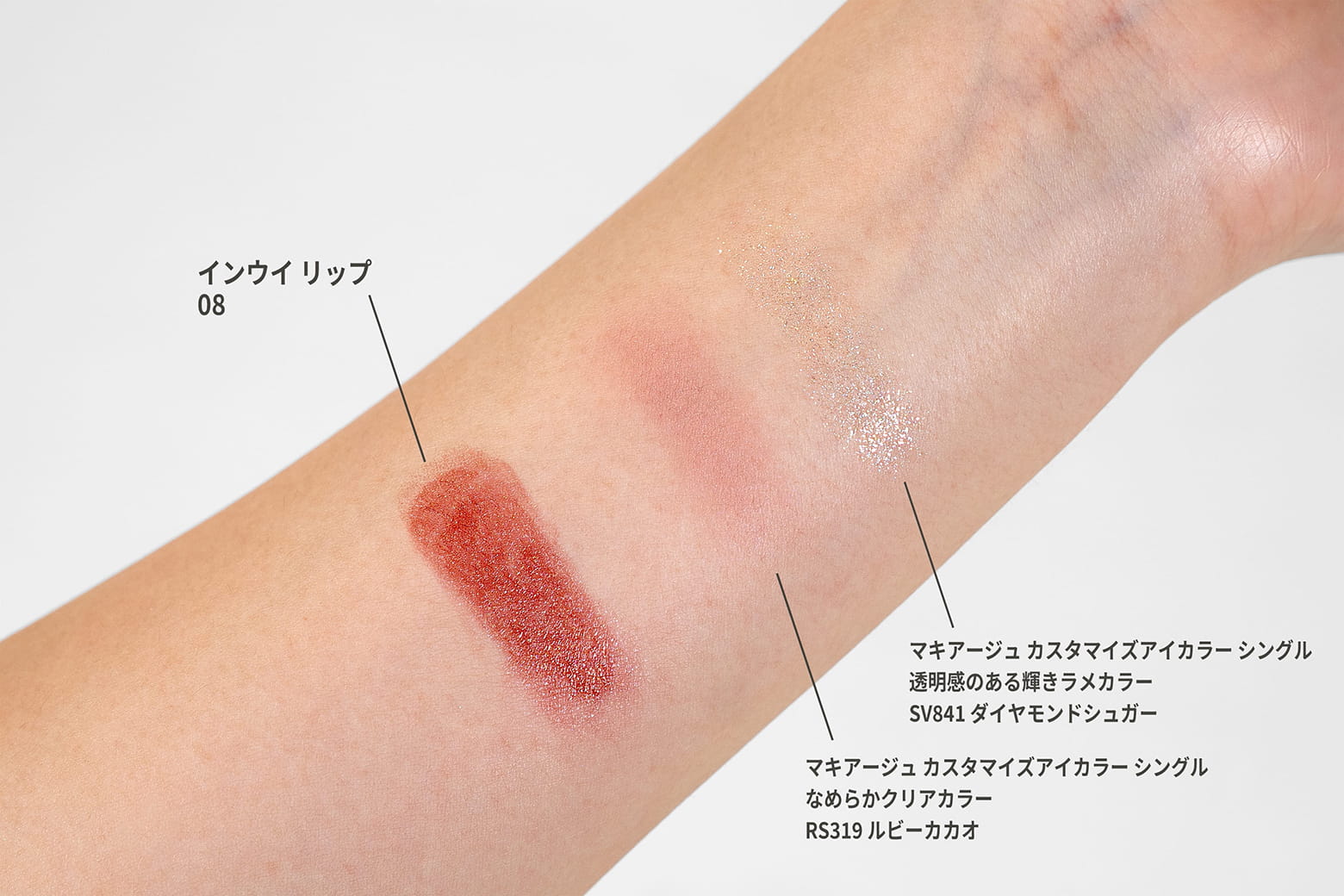 目もとにはマットな質感のマキアージュ カスタマイズアイカラー シングル なめらかクリアカラー RS319(マット) ルビーカカオに、ラメが輝くマキアージュ カスタマイズアイカラー シングル 透明感のある輝きラメカラー SV841 ダイヤモンドシュガーを重ねましょう。