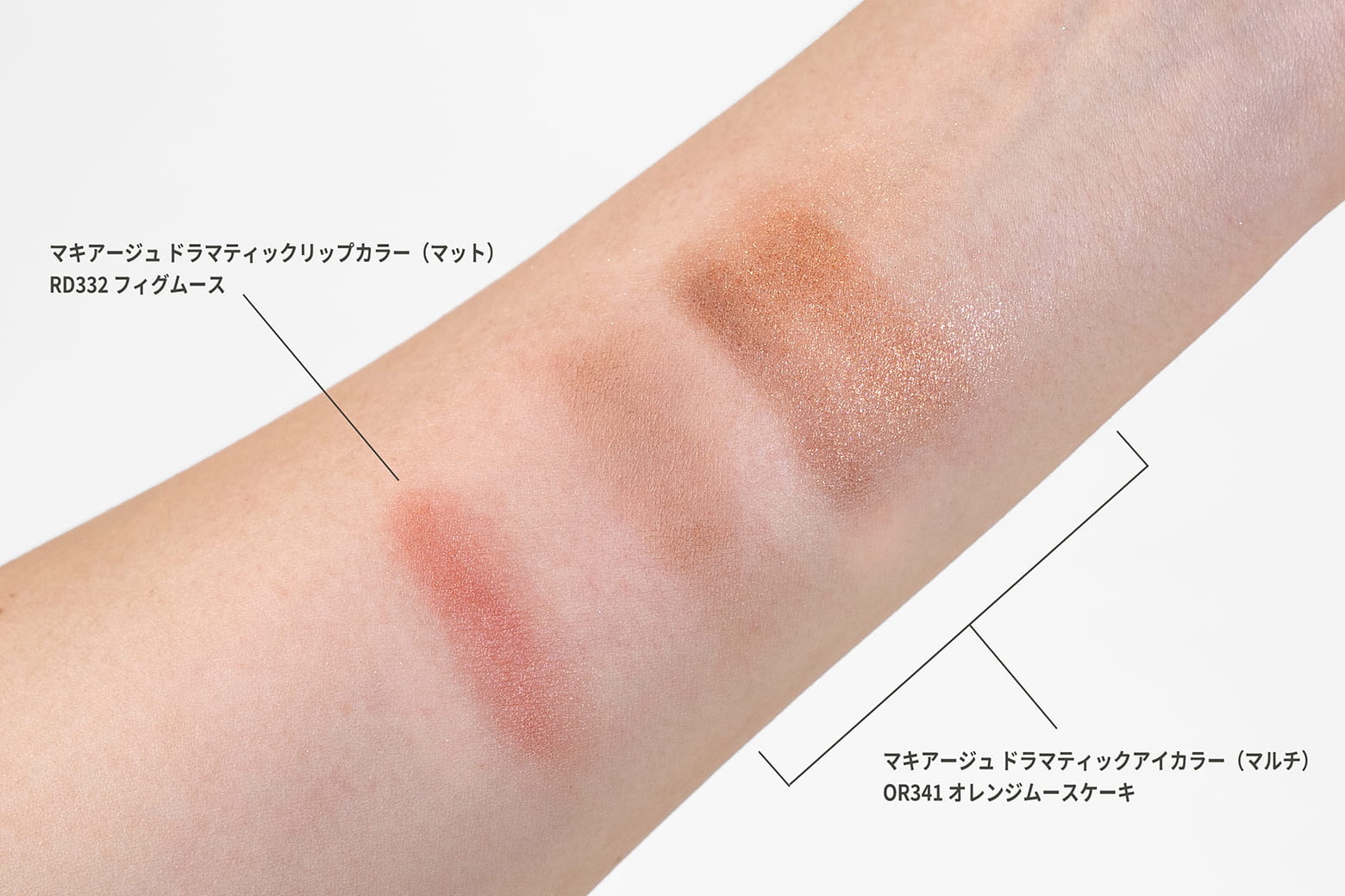 目もとには指1本で簡単にグラデーションができるマキアージュ ドラマティックアイカラー (マルチ) OR341 オレンジムースケーキ、口もとには血色感をプラスできるマキアージュ ドラマティックリップカラー (マット) RD332 フィグムースを。