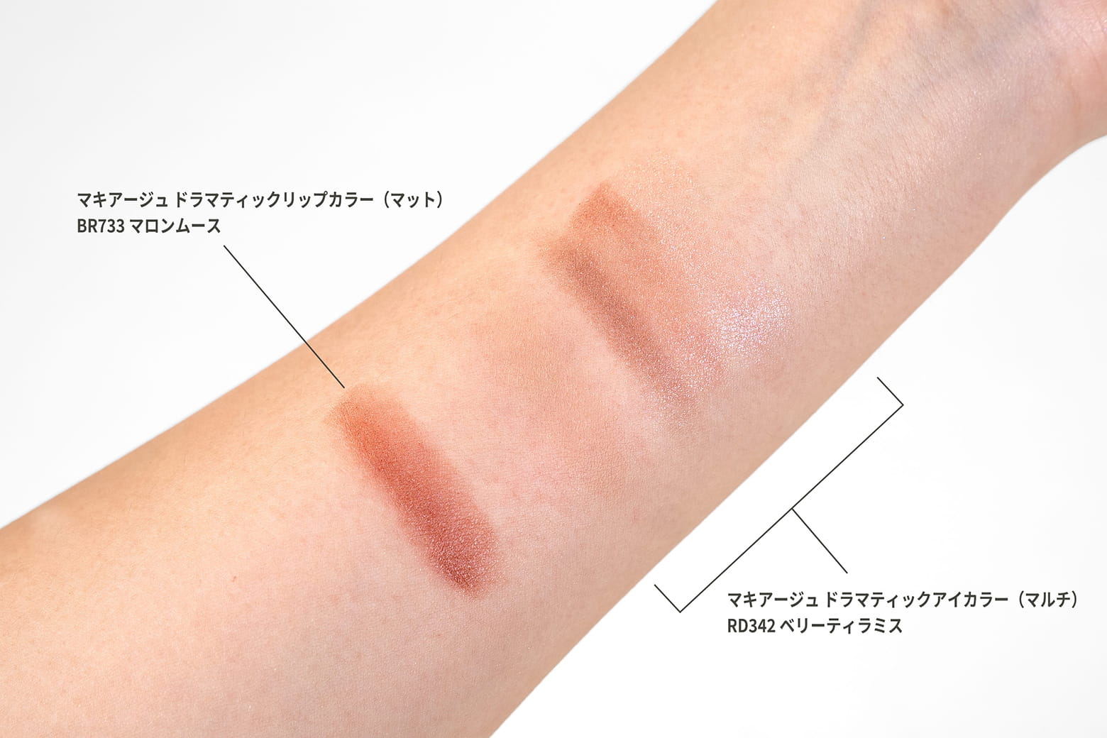 目もとにはソフトな質感で明るさをプラスできるマキアージュ ドラマティックアイカラー (マルチ) RD342 ベリーティラミス、口もとにはチークにも使えるマキアージュ ドラマティックリップカラー(マット) BR733 マロンムースを選択。