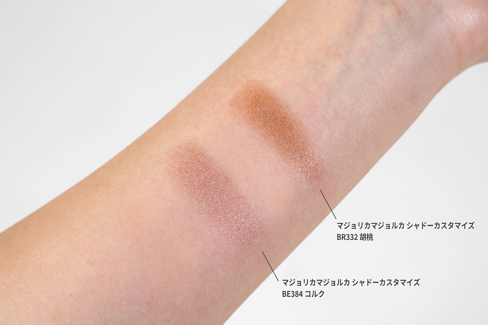 目もとには今っぽさと品を備えたベージュピンクのマジョリカ マジョルカ シャドーカスタマイズ BE384 コルクを、口もとには肌色まで美しく見せる色合いのインテグレート ジューシーバームグロス PK376を選びましょう。