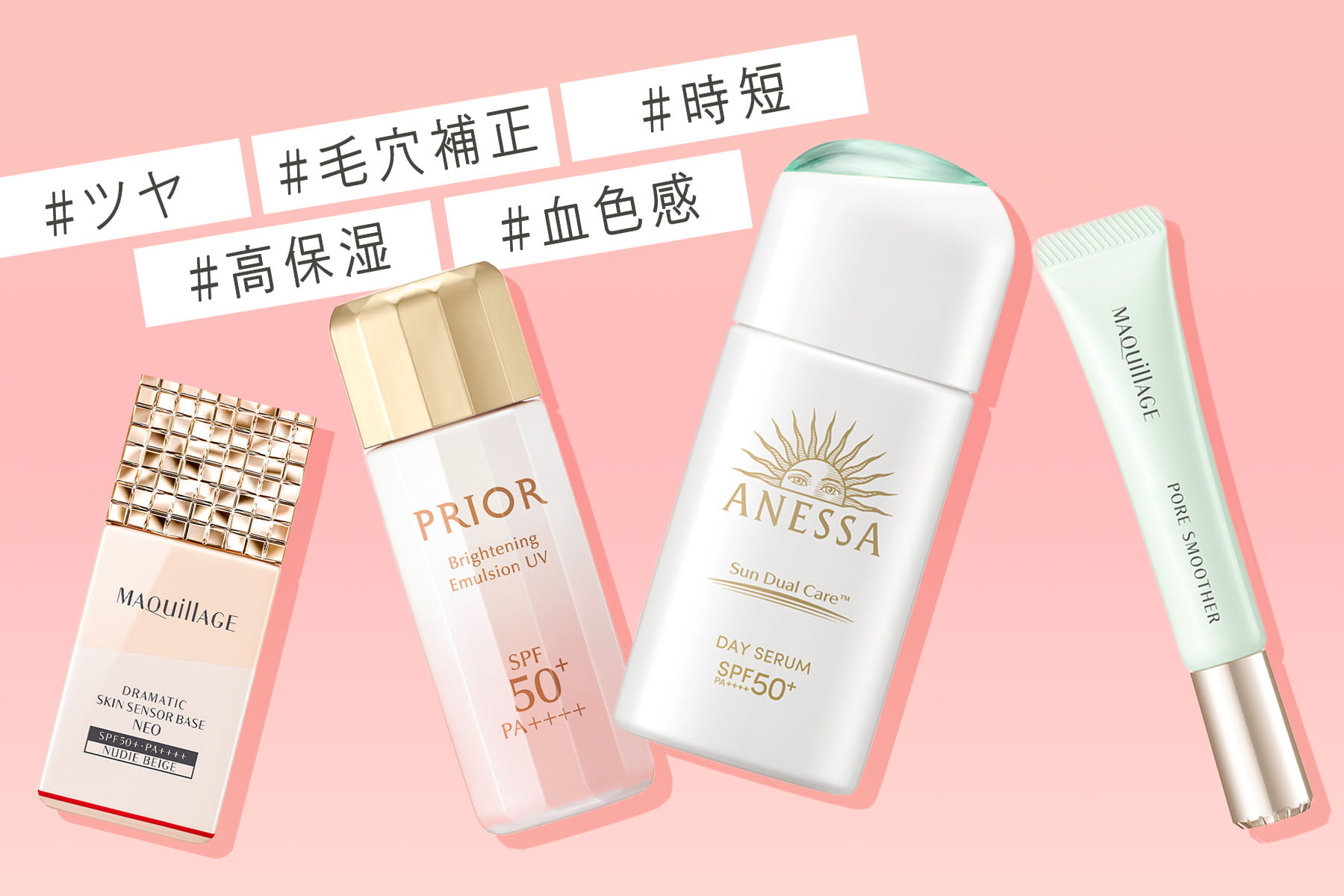 テカリ・カサつきダブルで防ぎ、スキンケアまで叶う、毛穴レスくずれ防止下地。 | 毛穴カバー&テカりレス処方で余分な皮脂を抑えてテカりを防ぎながら、毛穴を補正してつるんとした仕上がりが続く。 | 1品で簡単に、うるおうのにテカらず、毛穴をカバー。 | うるおいを与えて肌を育むスキンケア効果と、光の力で肌を補正するメイク効果を兼ね備えたデュアルプライマー。 | 素肌の美しさを際立てるみずみずしい透明感を叶える化粧下地。自ら発したような光を生むメイク効果とスキンケア効果を両立。 | 朝、化粧水のあとこれ1本。年齢サインを明るくカバーし、紫外線から肌を守り、うるおい続く。 | あなた自身が本来もつ骨格や血色感、肌の質感までも引き立て、内側から発光したようなつやを叶える化粧下地。 | 美容液でメイクする新発想。使うたび、毛穴レスな「極上つるん肌」へ。 | 日中ずっとトーンアップとハリ。乳液・化粧下地・UVカットに、トーンアップ効果まで。 | みずみずしい使用感で、瞬時にうるおいを与え、小じわ・毛穴・色ムラの目立たない、なめらかな素肌へ仕上げる。 |