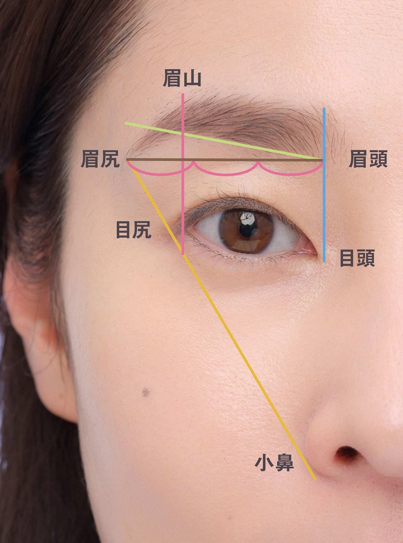 眉頭・眉山・眉尻の3点を意識して、左右の高さや太さ、角度をそろえることが重要。