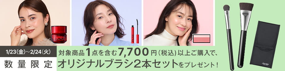 - ※ 2026年1月23日(金)~2月24日(火)に対象のアイテム(アイブロウ/アイシャドウ/アイライナー/チーク/フェイスカラー/マスカラ/リップライナー/口紅・リップグロス/リップベース/ネイル・ネイルケア/コフレ・その他/男性用メイク/BB・CC/化粧下地/ファンデーション/コンシーラー/おしろい・フェイスパウダー/トライアル・旅行用(ベースメイク)/その他(ベースメイク))を1品以上含む、1回のお買い物につき合計金額 7,700円(税込)以上ご購入の方に資生堂オンラインストア ブラシ2本セットをプレゼント。