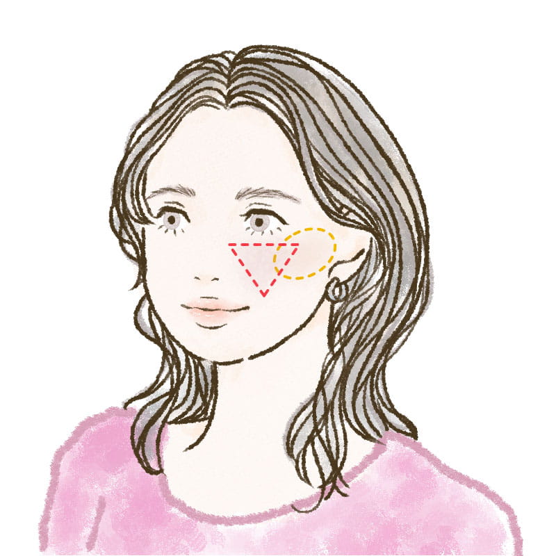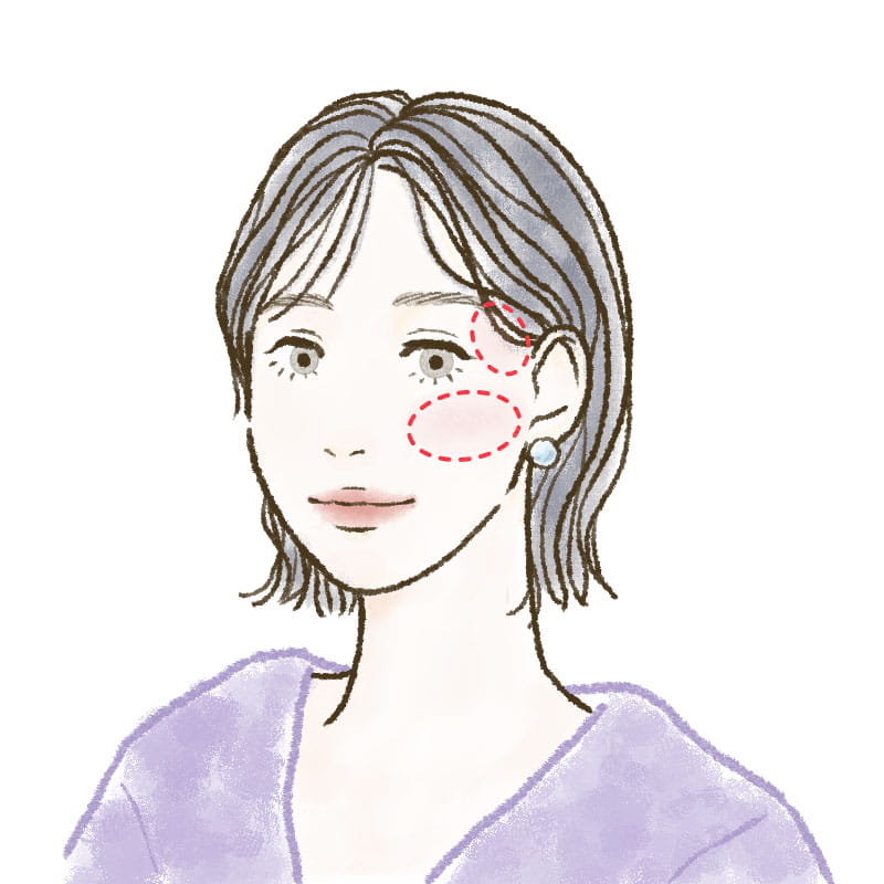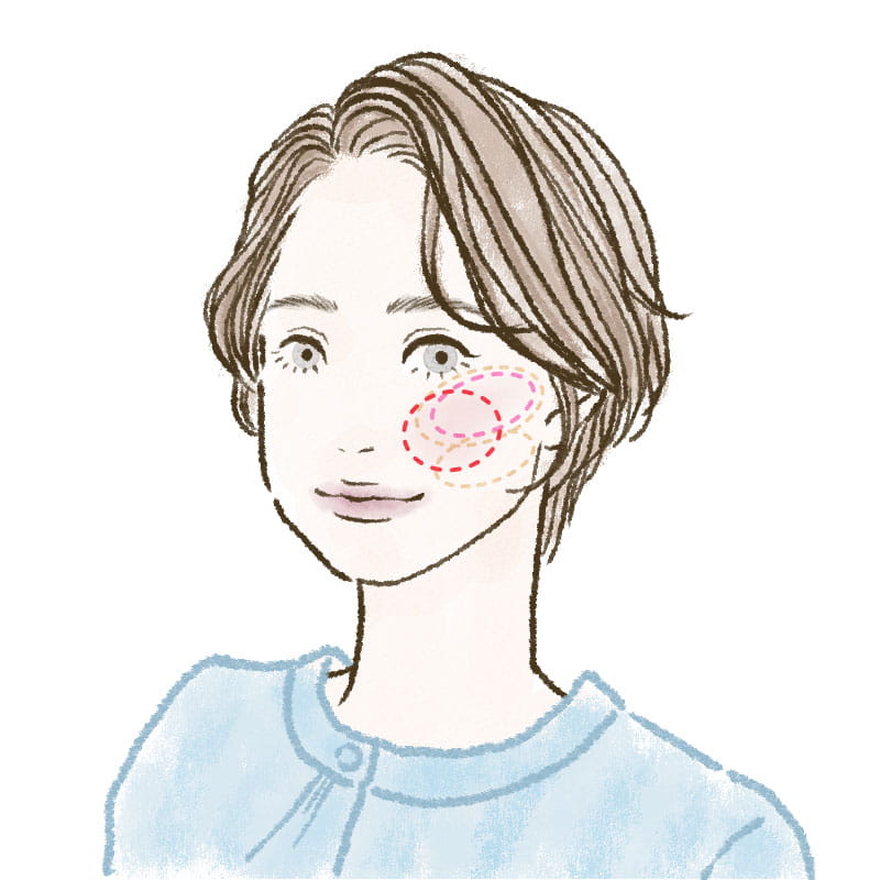 塗布するときは、笑ったときにほおが高くなる部分を中心に、丸く広めにのせるのがポイント。