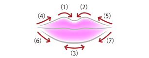 *初めて使用するときは指でブラシをほぐしてからご使用ください。1.ブラシに口紅をたっぷり含ませた後、筆先を平らにととのえます。2.口を軽く閉じた状態で、上唇の山と下唇の位置を決めて描きます。(図の1~3)3.口角から中央に向かって輪郭を描きます。(図の4~7)4.最後に内側をぬります。<お手入れ方法>●使用後はブラシについた口紅をティッシュペーパーでふきとって、いつも清潔にしてください。