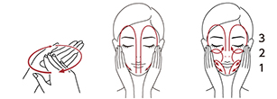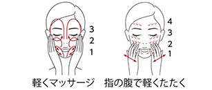 2回目(0.5mL)を顔に塗布して、●手のひら全体を使い、軽く圧をかけながら下から上へ軽くマッサージするようになじませます。●顔全体に活力を与えるように指の腹部分でポンポンとリズミカルに叩きます。